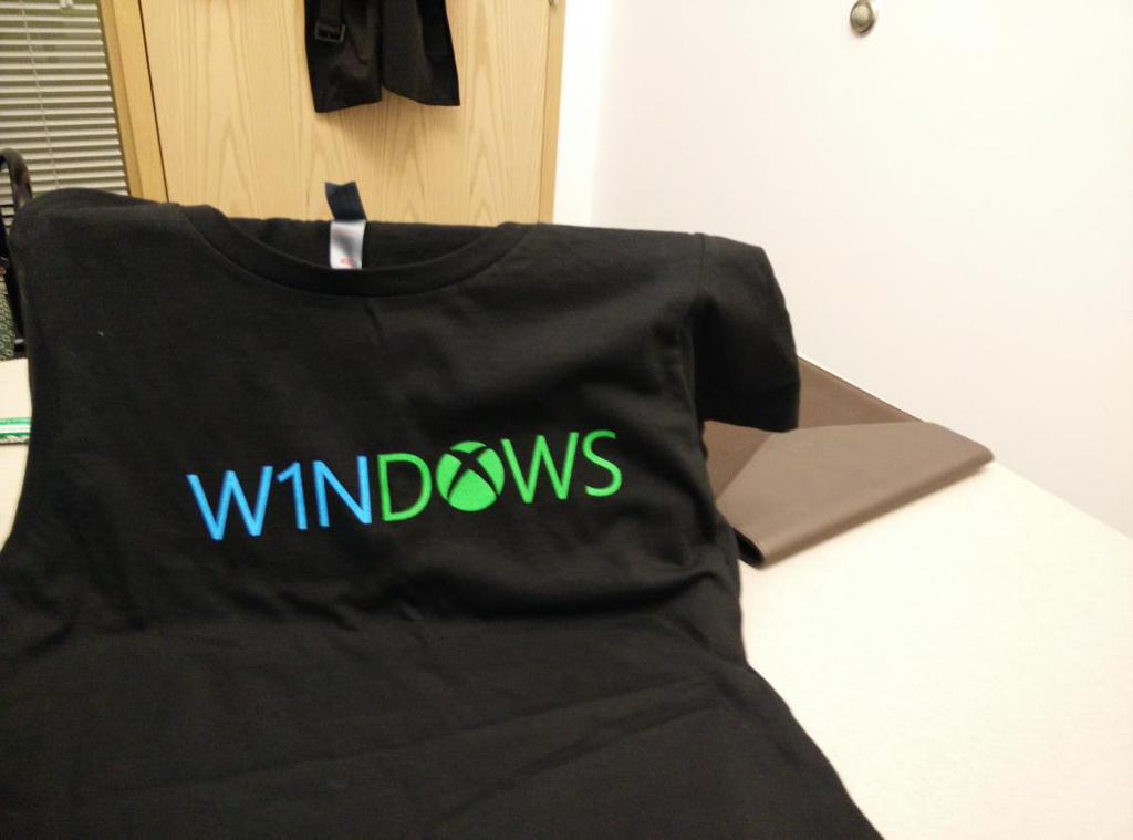Neben Gerüchten, dass möglich sein wird Xbox-Titel auf allen auf Windows-basierenden Geräten zu spielen, könnte viel Wahres an der „Partnerschaft“ zwischen Windows 10 und der Xbox One sein. Bekannt ist, dass die Xbox One bald mit dem neuen System ausgestattet sein wird, in welcher Form auch immer. Mehr Zündstoff zu dieser Debatte kommt nun von Microsoft selbst. Via Twitter tauchte nun das folgende Foto eines Shirts auf: