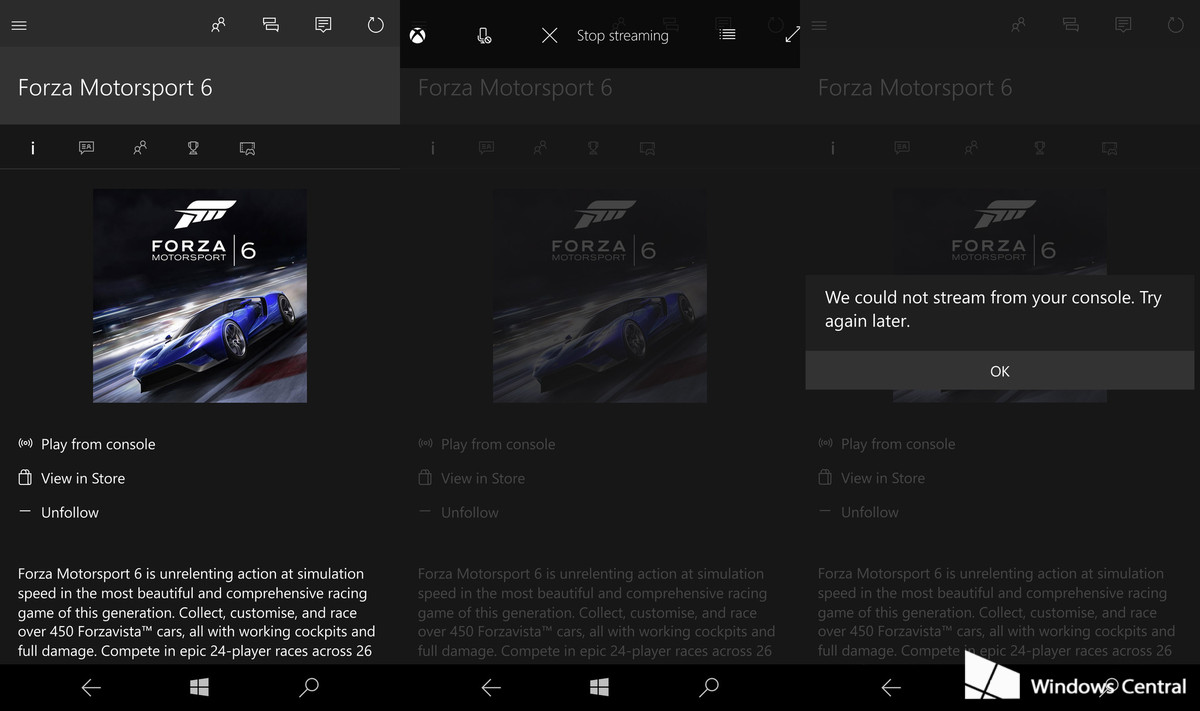 Die Kollegen von WindowsArea.de haben nun in der Preview Build 14342 im Fast Ring unter Windows 10 Mobile in der Xbox App eine erstaunliche Entdeckung gemacht, die zeigt, dass die Streamingfunktion auch hier zu laufen scheint. Auf dem Desktop wäre das wie gesagt kein Problem, doch kommt es nun auch für die mobile Variante? Auf den Bildern unten sieht man den Button „Auf Konsole spielen“, der in der normal Version am PC auch verfügbar ist. Klickt man in dieser Version am Windows 10-PC darauf, kann man sofort loslegen und seine Spiele streamen. Doch klickt man nun auf den Button der mobilen Variante, so erscheint nur eine Fehlermeldung, die darauf hinweist, in seinen Konsoleneinstellungen die Streamingfunktion zu aktiveren.