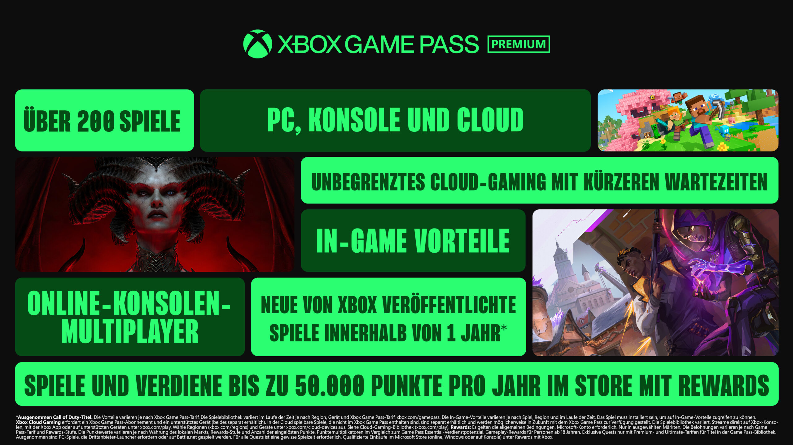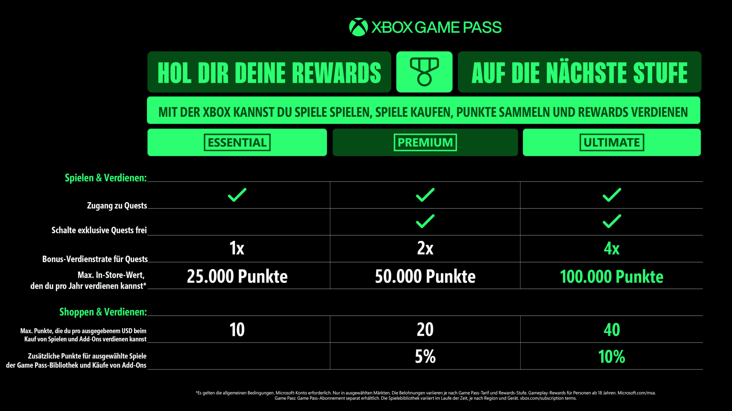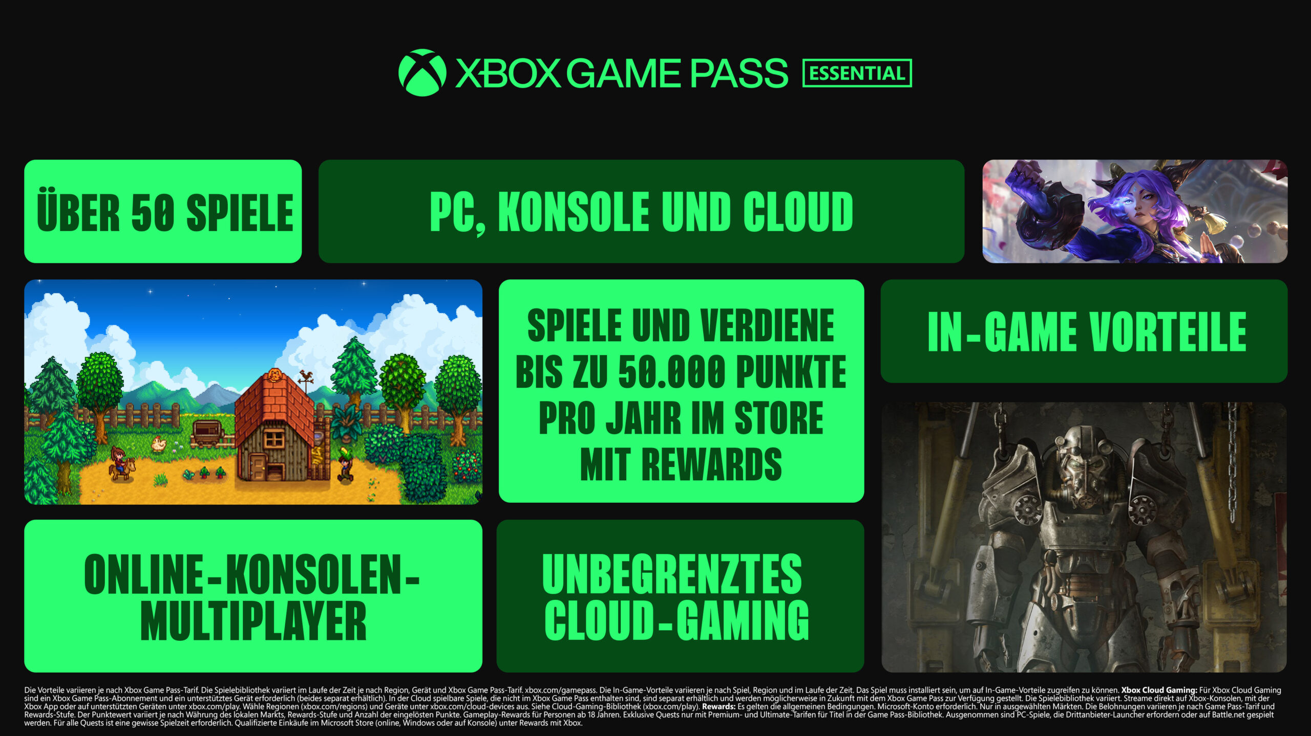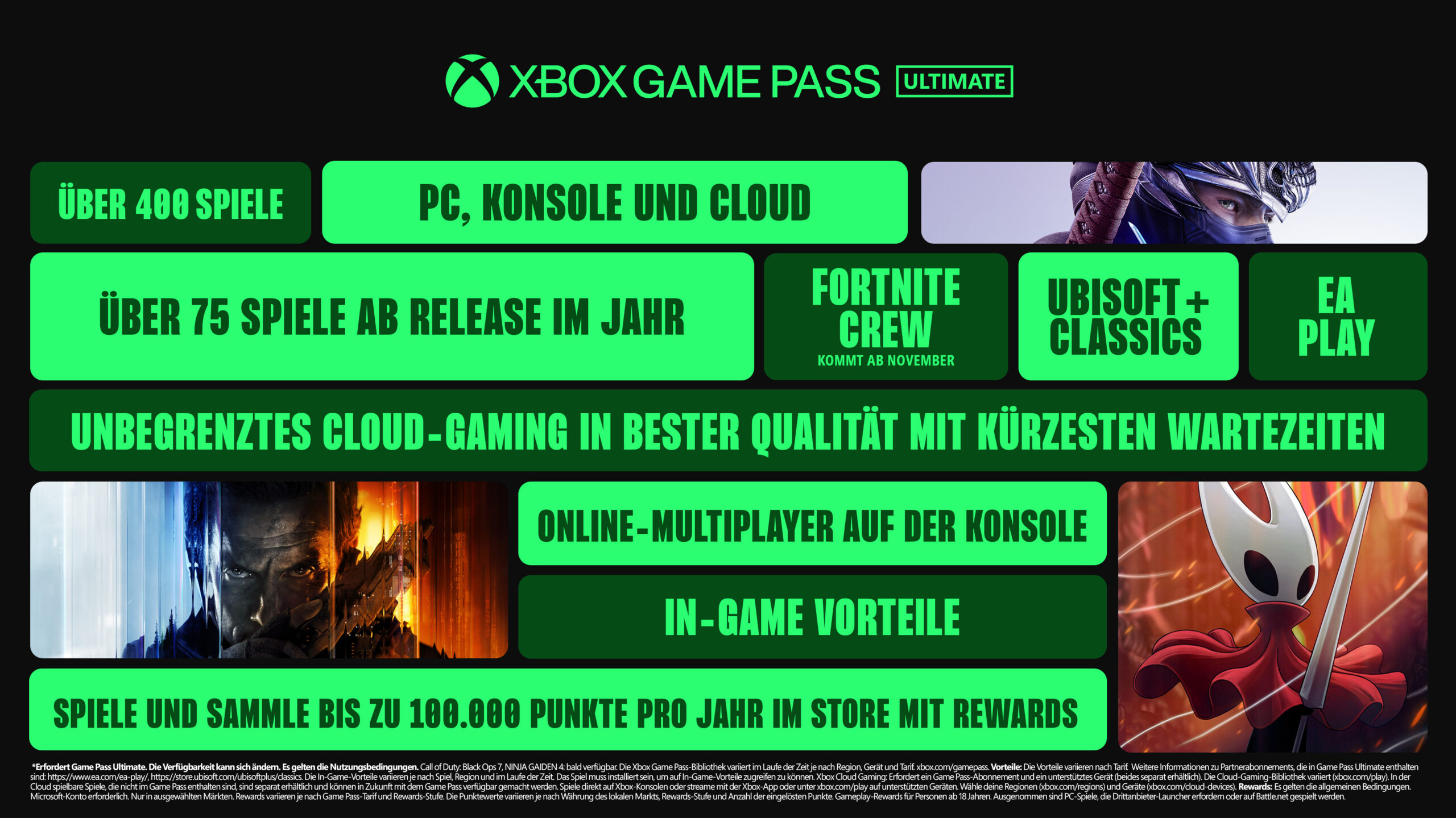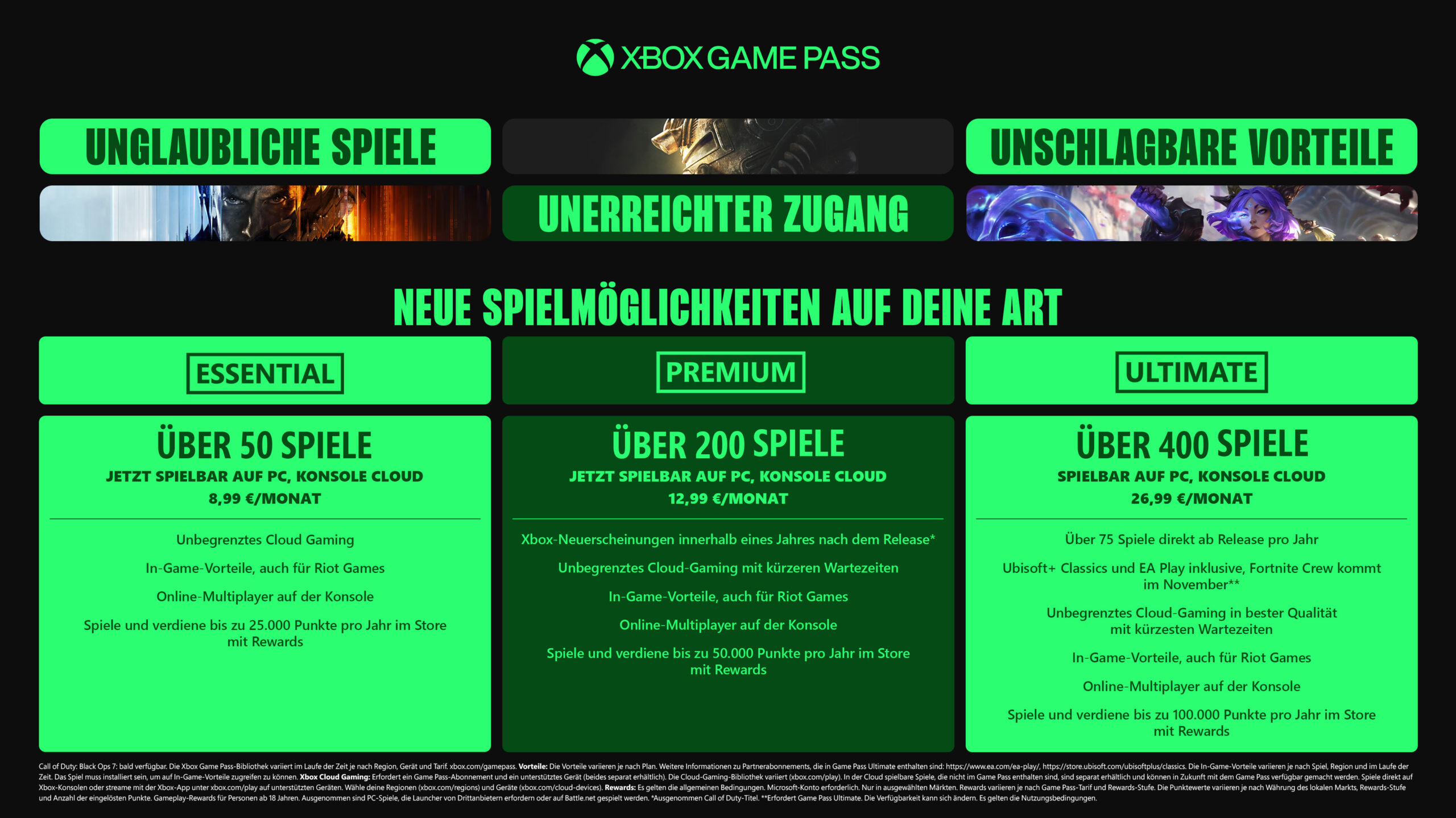 Jeder Plan beinhaltet erweiterte Spielebibliotheken, einschließlich PC-Spiele, unbegrenztes Cloud-Gaming, In-Game-Vorteile (einschließlich Riot Games-Titel) und ein überarbeitetes Rewards with Xbox–Erlebnis. Für Xbox Game Pass Ultimate-Mitglieder führen wir unser bisher umfangreichstes Upgrade ein, das mehr Spiele direkt zum Launch als je zuvor mitbringt, zum ersten Mal Fortnite Crew und Ubisoft+ Classics inkludiert, verbesserte Xbox Cloud Gaming-Streaming-Qualität mit bis zu 1440p und vieles mehr umfasst.