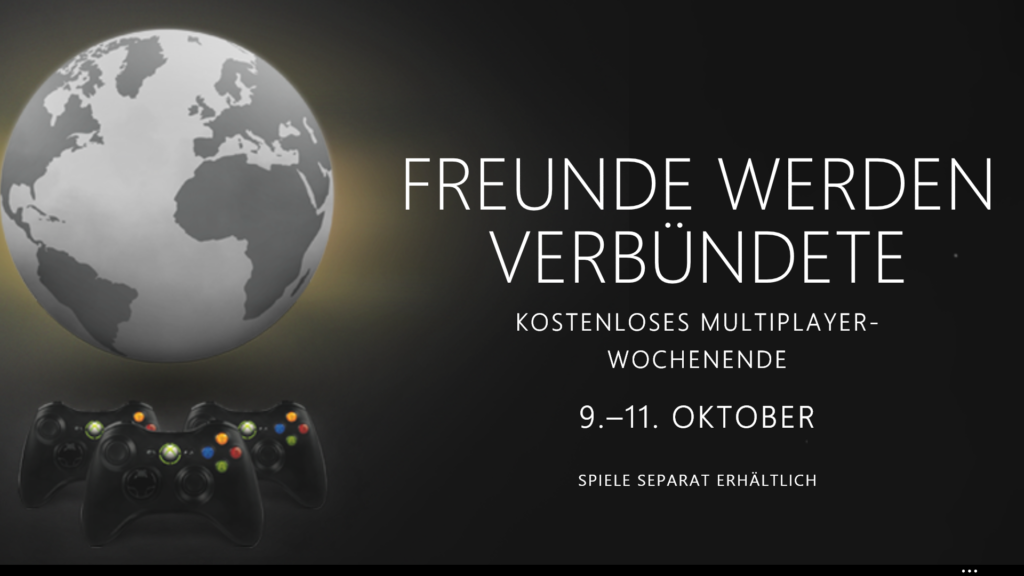 Es ist wieder soweit! Microsoft lädt euch wieder zum kostenlosen Xbox Live Goldwochenende ein, bei dem ihr alle Vorteile genießen könnt, den normalerweise Xbox Live Goldmitglieder genießen. Schnappt euch also ein paar Snacks, und macht es euch gemütlich. Am diesem Wochenende vom 9.–11. Oktober ist der Multiplayer auf Xbox 360 für euch kostenlos. Freut euch auf Gefechte Seite an Seite mit euren Freunden und Verbündeten, und erlebt eure Lieblingstitel auf einer völlig neuen Ebene. Das dürft ihr nicht verpassen. Spielt online gemeinsam mit Freunden – nur dieses Wochenende kostenlos.